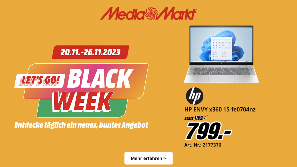 Entdecke den Black Friday bei MediaMarkt mit dem HP ENVY x360 15-fe0704nz für nur 799.- statt 1199.-.