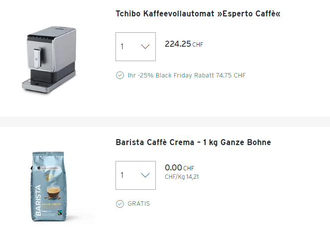 Auch interessant dürfte der Tchibo Kaffeevollautomat für 224.25 Franken sein. Im Grunde dürfte dies eine getartne Koenig Finessa Maschine sein. Hier noch inkl. 1kg Kaffeebohnen Barista Caffè Crema