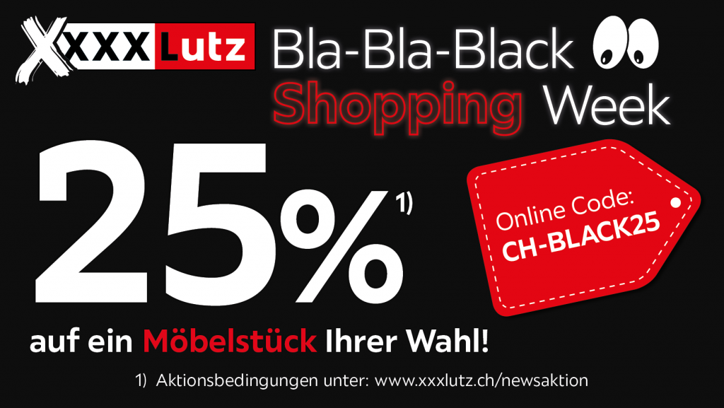 Mit dem Code “CH-BLACK25” kann man sich bei XXXLutz bis zum 28.11. 25% Rabatt auf ein Möbelstück sichern.