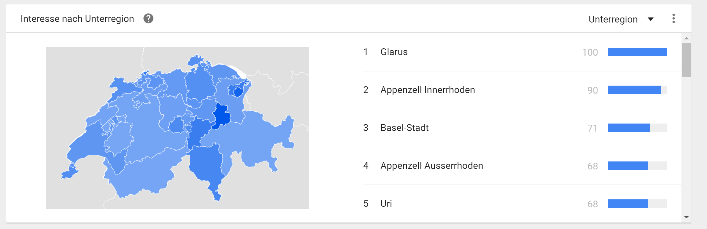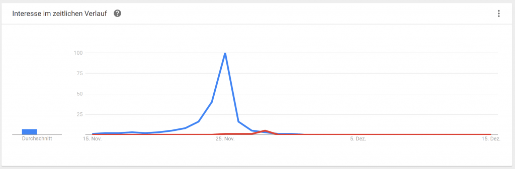 Zudem ist in dieser Grafik sehr gut sichtbar, dass das Interesse am Black Friday Schweiz ungefähr eine Woche vor dem Black Friday beginnt und eine Woche nach dem Black Friday bereits praktisch vollständig erloschen ist.
