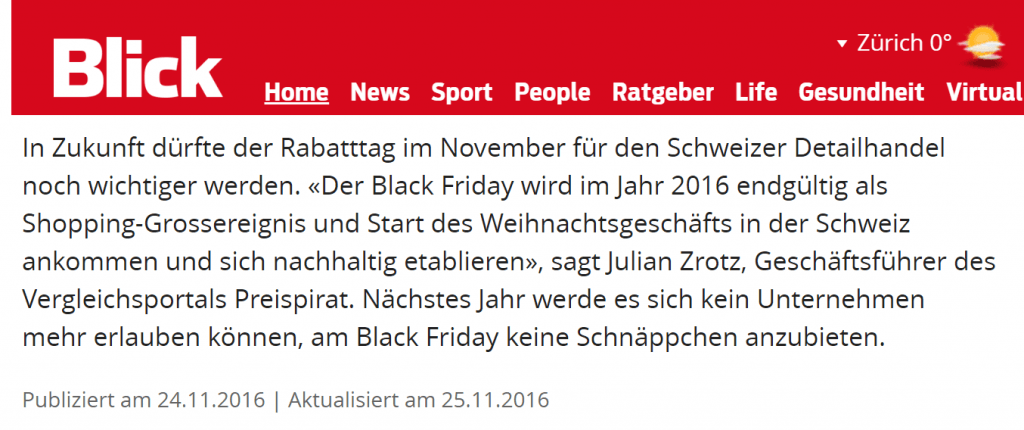 Zudem wurden wir auch in grossen Schweizer Medien aufgenommen. Der Blick zitierte uns in ihrem Leitartikel zum Black Friday. FM1Today verlinkte uns in ihrem Black Friday Beitrag.