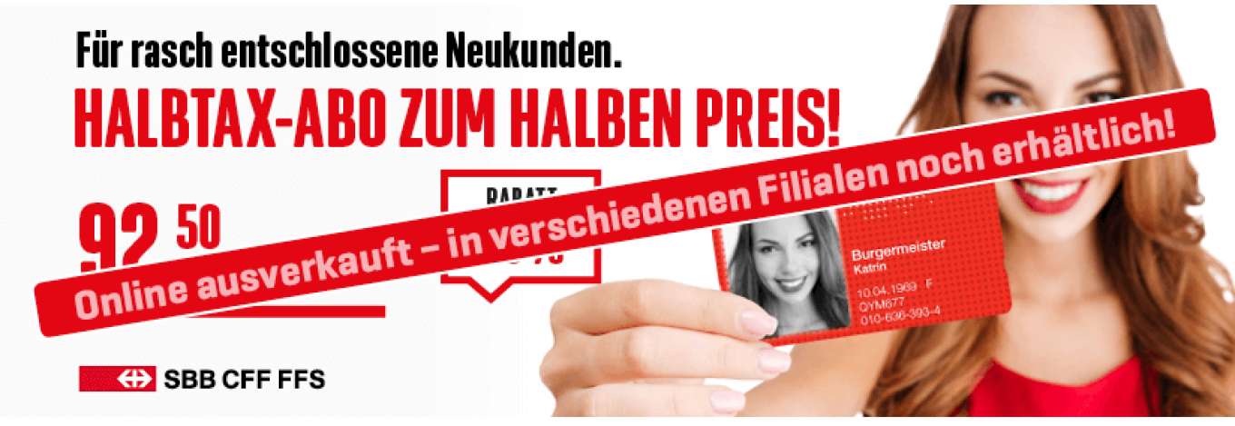 - Interdiscount: Das Halbtax zum halben Preis ist letztes Jahr so stark eingeschlagen, dass es bereits nach wenigen Stunden zum ersten Mal ausverkauft war. Zuschlagen konnte während dieser kurzen Zeit auch nur, wer wirklich Glück hatte: Die Website war meistens überlastet. Immerhin gab’s im Verlauf der Woche nochmals Nachschub.