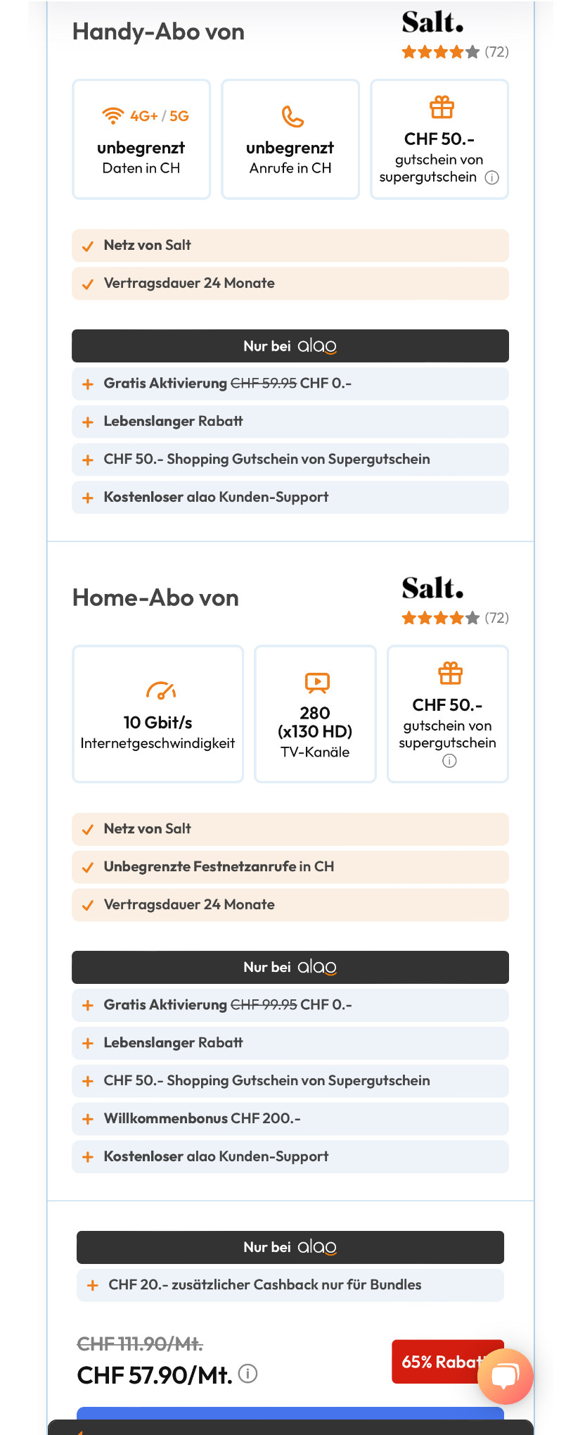 (Bei Alao gäbe es noch 50.- „Supergutschein“ zum Abo, in Kombination mit dem Salt Fiber 39.95 gäbe es nochmals 50.- Supergutschein, Plus 220chf Cashback, macht dann auf 2 Jahre gerrechnet 48.70+100chf Gutscheine /// oder 44.56/Monat je nachdem wie mans Rechnet 🥸)