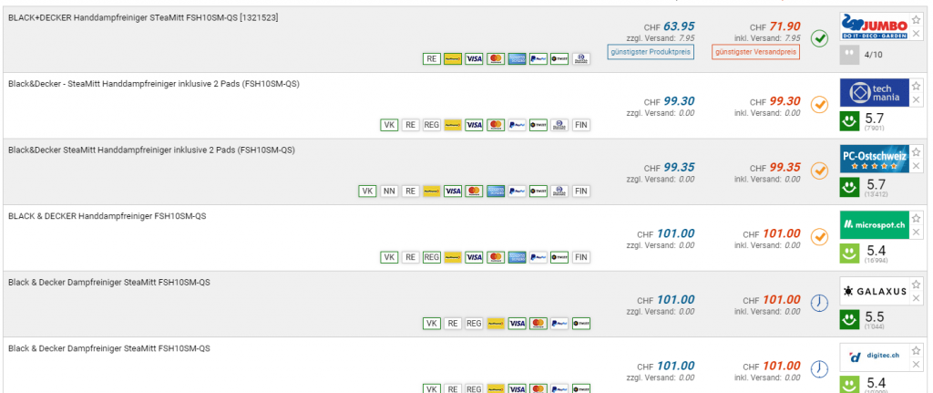 Bei Jumbo gibt es den BLACK+DECKER HANDDAMPFREINIGER STEAMITT für den neuen Bestpreis von CHF 71.90. Der vorherige Bestpreis war CHF 87.15. Der zweitbeste Preis beträgt CHF 99.30.