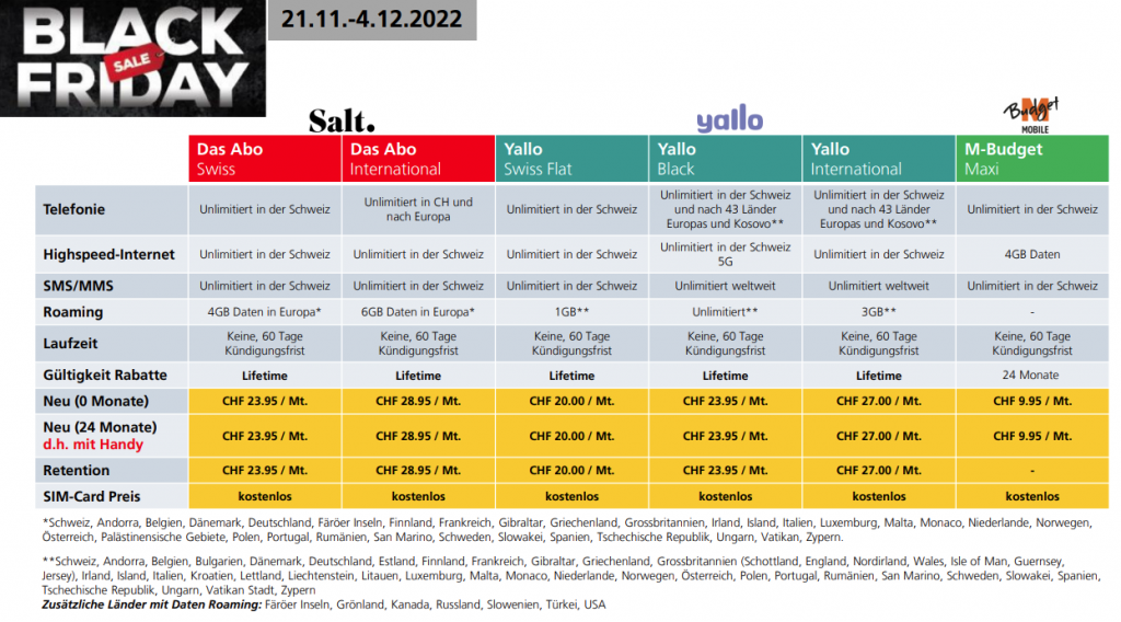 - Unlimitierte Anrufe und SMS in der Schweiz und in 43 Ländern Europas und Kosovo «inkl. 3GB Roaming»
