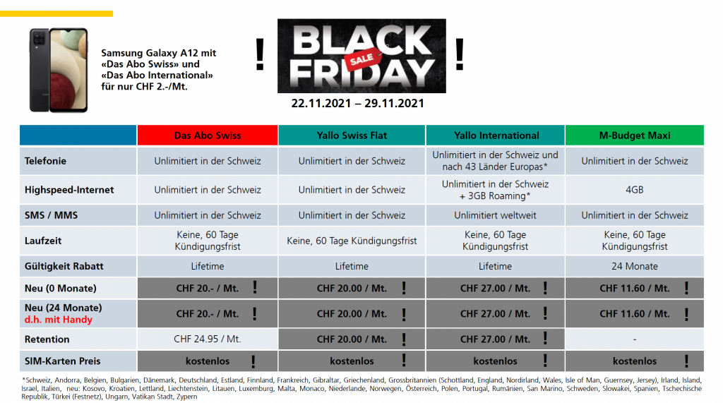 - Unlimitierte Anrufe und SMS in der Schweiz und in 43 Ländern Europas und Kosovo «inkl. 3GB Roaming»