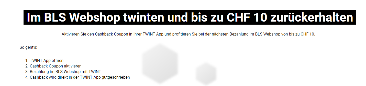 Wer in Bern unterwegs ist erhält jetzt 10CHF Cashback einmalig wenn er ein BLS-Ticket kauft. In der App steht nur „Solange Vorrat - aktivierte Codes werden automatisch gelöscht“, also ist nicht abzusehen, wann die Aktion endet.