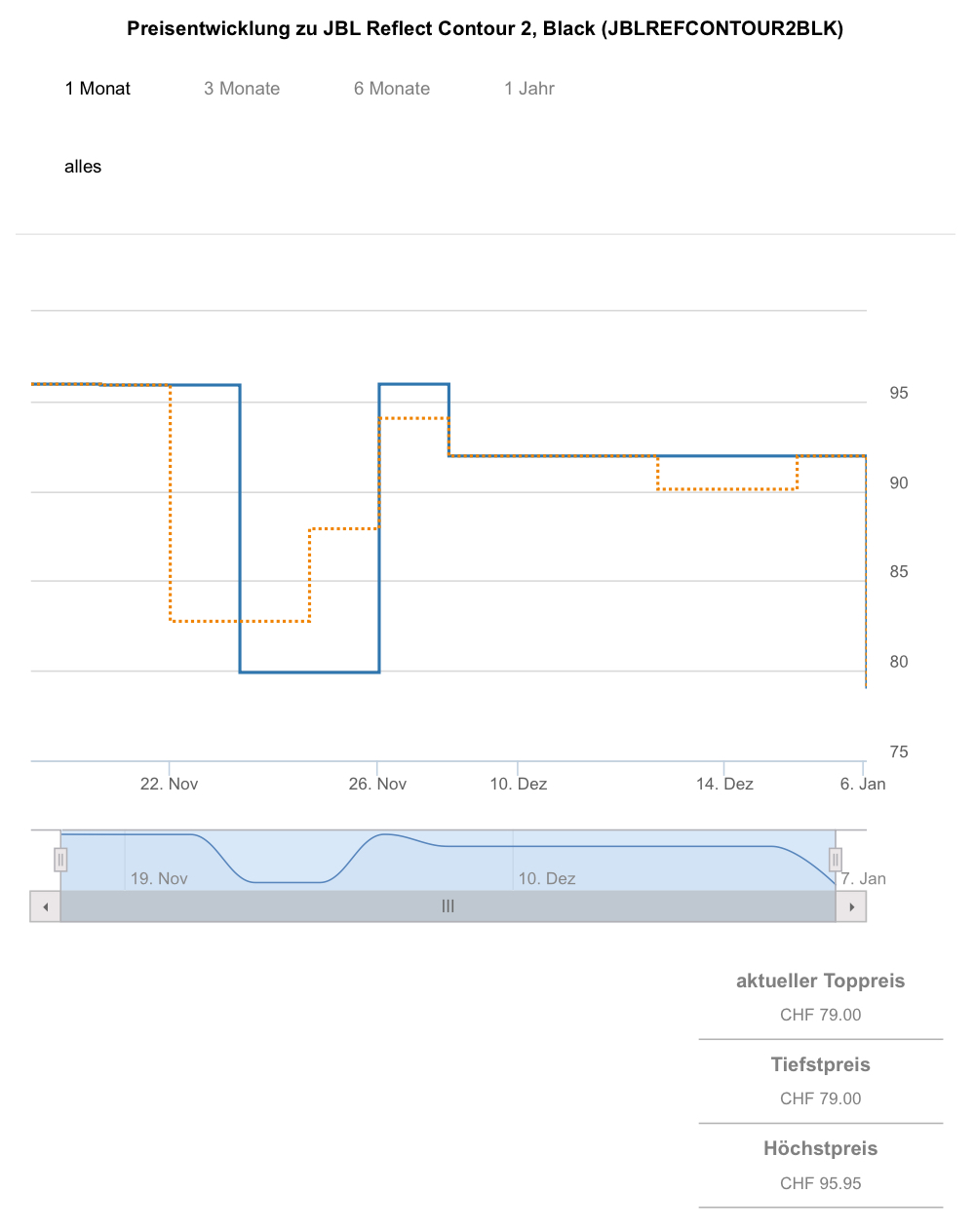 Gemäss toppreise war der bestprice bislang bei 82.75 CHF, der zweitbeste Preis liegt aktuell bei 91.95 CHF.