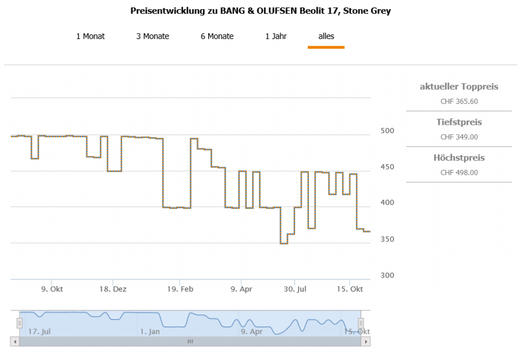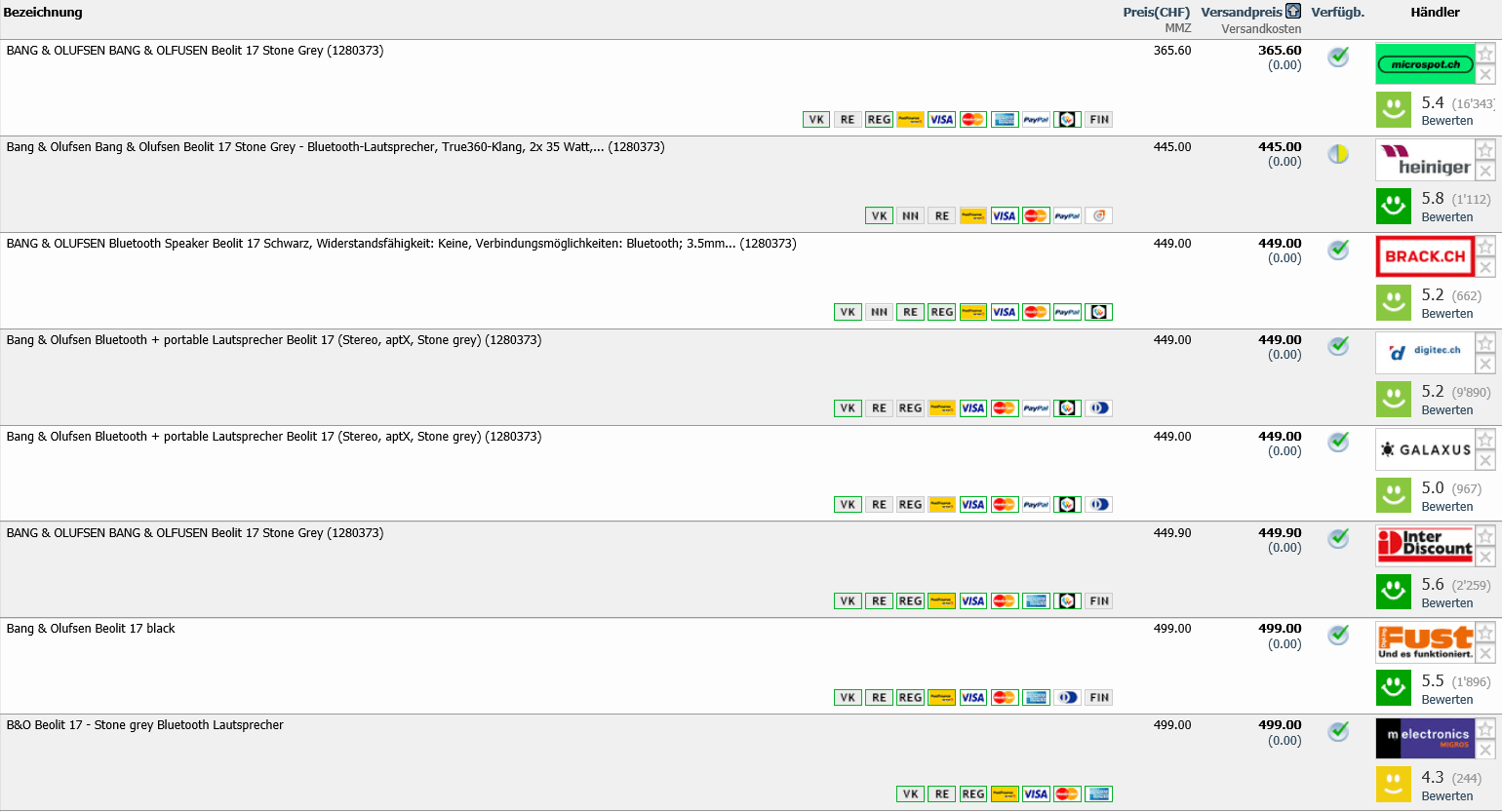 Gemäss toppreise gab es den Lautsprecher in der Farbe Stone Grey bislang nie günstiger als für 349.- CHF, der zweitbeste Preis liegt aktuell bei 365.60 CHF. In der Farbe Natural gab es ihn bei microspot einmal für 289.60 CHF.