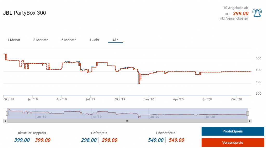 Bei amazon.de gibts derzeit die mobilen Bluetooth-Lautsprecher PartyBox 300 von JBL zum Aktionspreis von 353 Franken inkl. Versand in die Schweiz. Laut toppreise ist dies zwar kein Bestpreis (dieser lag scheinbar bei CHF 298.-), zuletzt erreichte er diesen Preis aber letztes Jahr im Dezember.