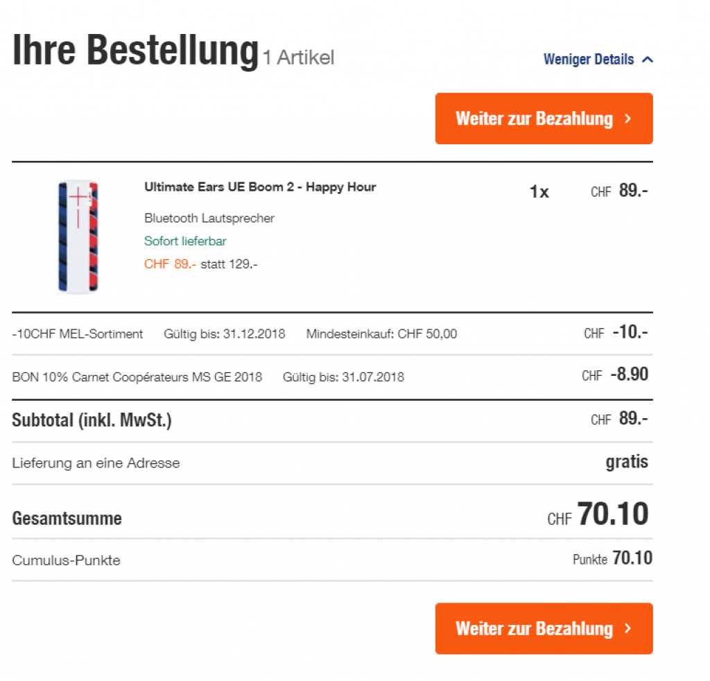 Günstiger als am Black Friday! Bei melectronics gibt’s die UE Boom 2 in der Farbe „Happy Hour“ für CHF 70.90, wenn man die untenstehenden Gutscheincodes einsetzt. Momentan erhält man die UE Boom 2 nicht günstiger als für CHF 99.90 Unter CHF 79.- habe ich noch keine UE Boom 2 gesehen.