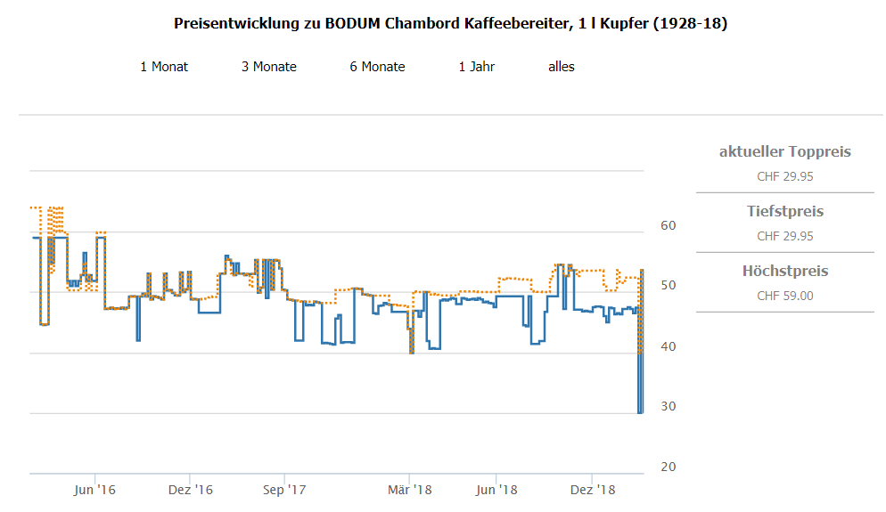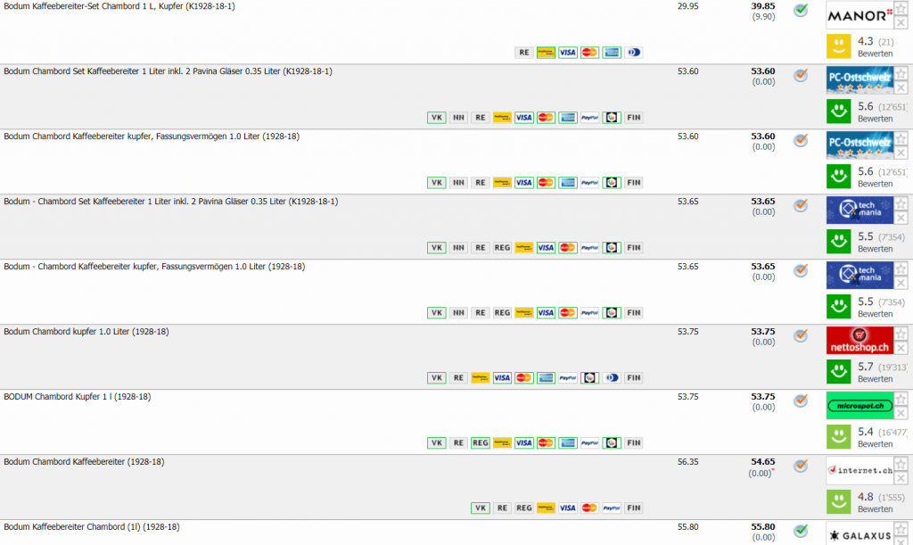 Bei Manor im Sale gibt’s den BODUM Chambord Kaffeebereiter, 1 l Kupfer für CHF 29.95. Hinzu kommen leider noch Versandkosten von CHF 9.90, ausser man holt das Set in einem der Manor Warenhäuser ab.