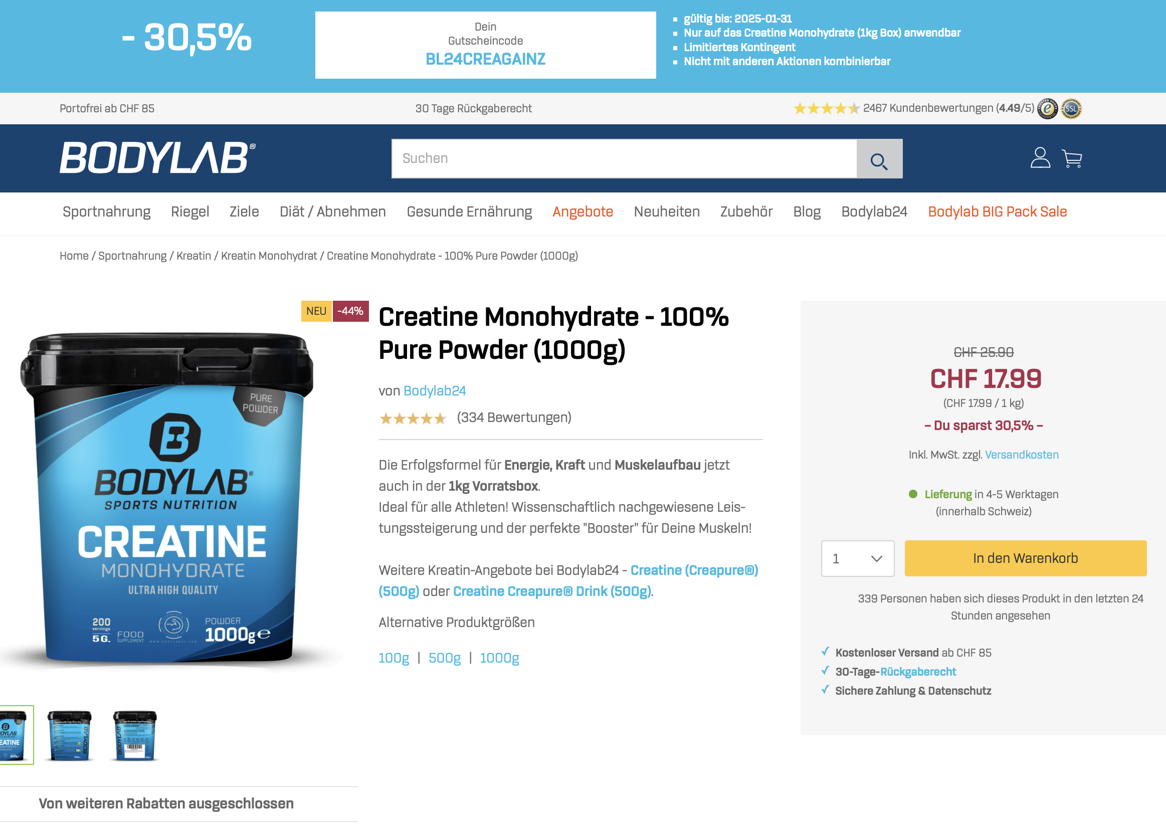 Die verkaufen 1,5kg für CHF 39.90, wären daher 26.60 Fr. pro KG, dazu kommen aber noch 5.90 Porto und wir landen bei 32.50! Daher ist die Ersparnis 23% gegenüber Lee Sport. Und ja ich weiß, es ist kein Creapure, bietet aber Bodylab auch ab und an für 29 Fr. an. Einfach mal Augen offen halten.