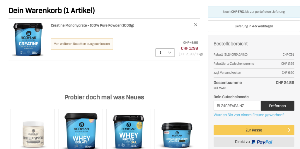 Auf die 1kg Creatine Box gibt’s aktuell zusätzlich 30% Rabatt und ihr zahlt mit dem Code BL24CREAGAINZ 18,- + Porto bzw. 24.89 Franken inkl. Porto und damit knapp 1 Fr. günstiger als noch vor einem Jahr. Als Vergleich wollte ich Lee Sport heranziehen, welcher allerdings nur noch das wesentlich teurere Creapure Creatine für umgerechnet 31,- Fr. / Kilo verkauft. Wem also das normale Creatine Monohydrat (vermutlich aus China) ausreicht, kann hier zugreifen. Habe eben schon bestellt.