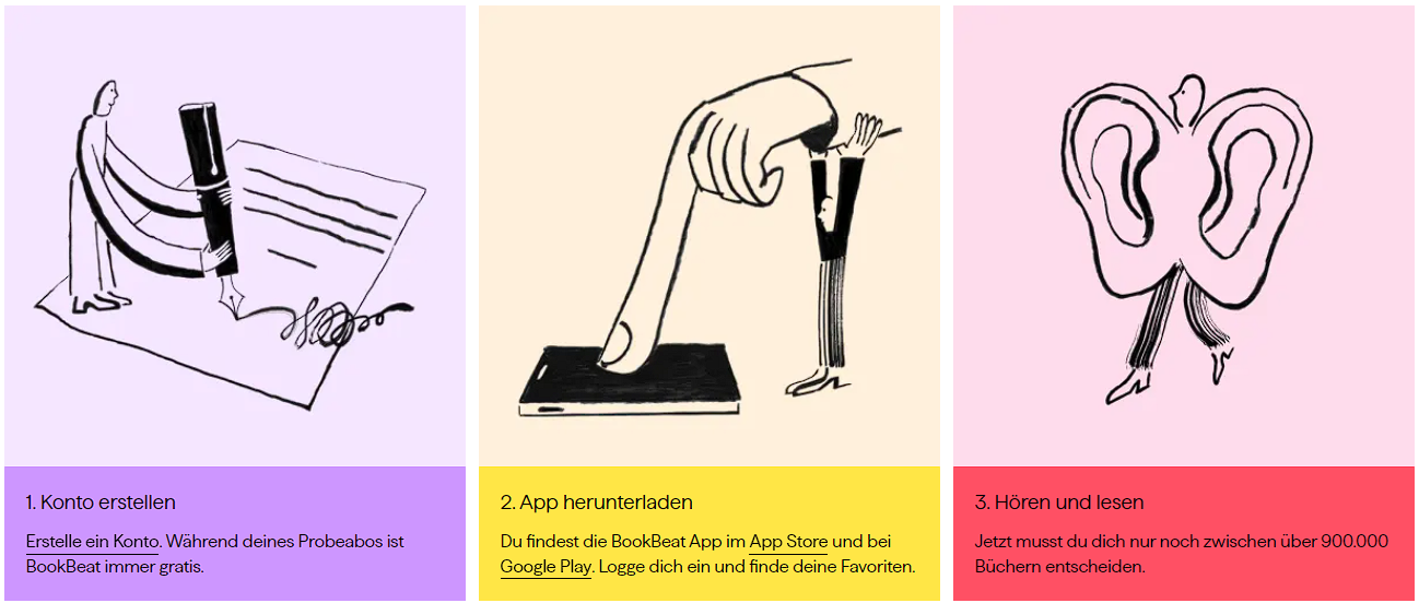 Wenn gewünscht, kannst du mit unserer Basis-Version fortsetzen, mit der du 20 Stunden im Monat hören kannst. Falls das nicht reicht, kannst du Standard mit 40 Stunden im Monat wählen und wenn du noch mehr hören möchtest, ist das Premium-Abo für dich das richtige. Hier erhältst du 100 Hörstunden pro Monat. Du kannst immer hören wann und wo du willst!”