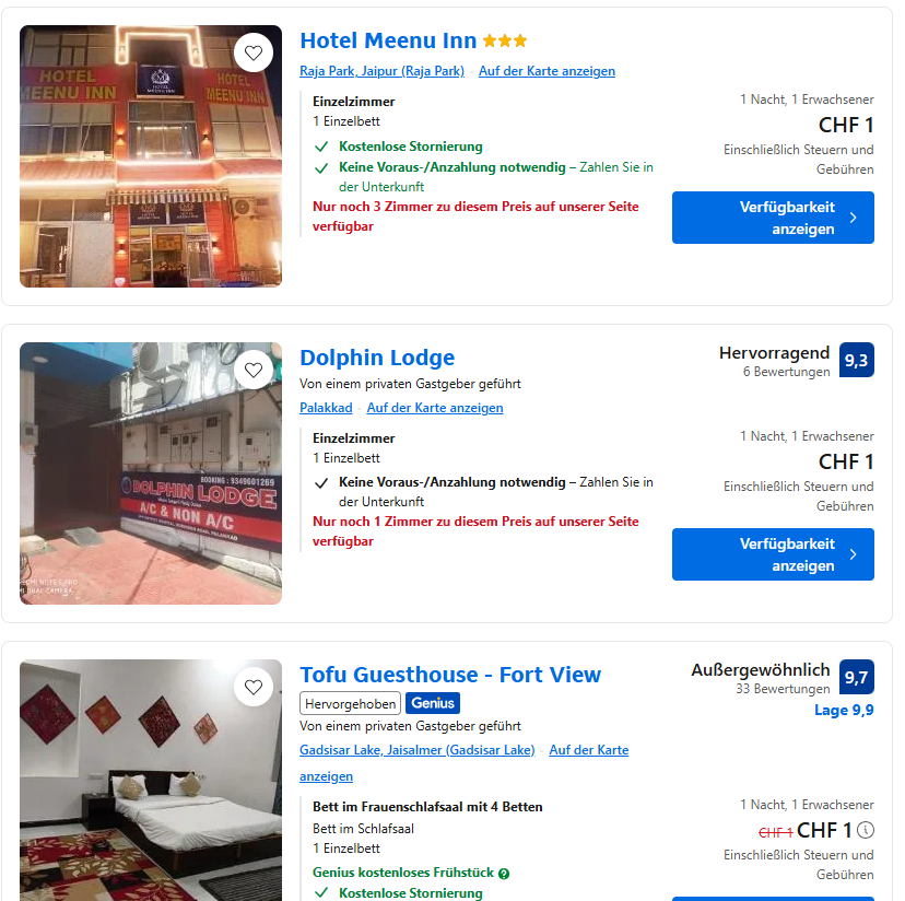 Dieser Trick ist seit Jahren bekannt. Es ist ganz einfach, gebt bei Booking INDIEN ein, 1 Person. Sortiert nach Preis und bucht für 1 CHF. Wichtig ist, dass ihr verschiedene Hotels zu verschiedenen Zeiträumen bucht. Es ist ansonsten schon zu Kontosperrungen gekommen, wenn das gleiche Hotel 15 x am selben Tag gebucht wurde.