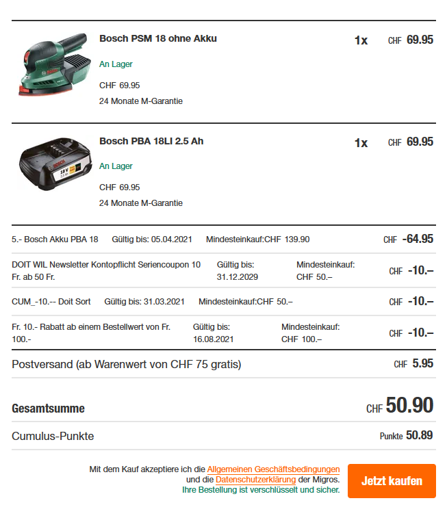 Ich habe z Bsp. den Multischleifer Bosch PSM 18 LI und den Akku für nur CHF 64.95 bekommen.