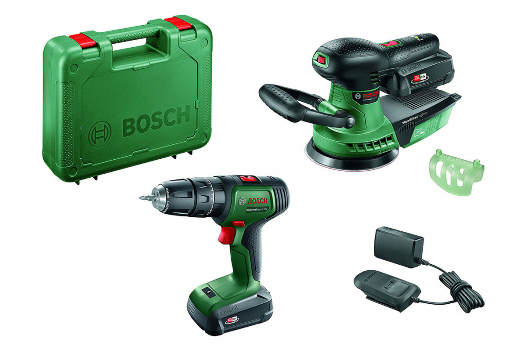Im Set befinden sich ein Schlagbohrschrauber UniversalImpact 18V und Exzenterschleifer AdvancedOrbit 18V, inkl. Akku, Ladegerät und Koffer.