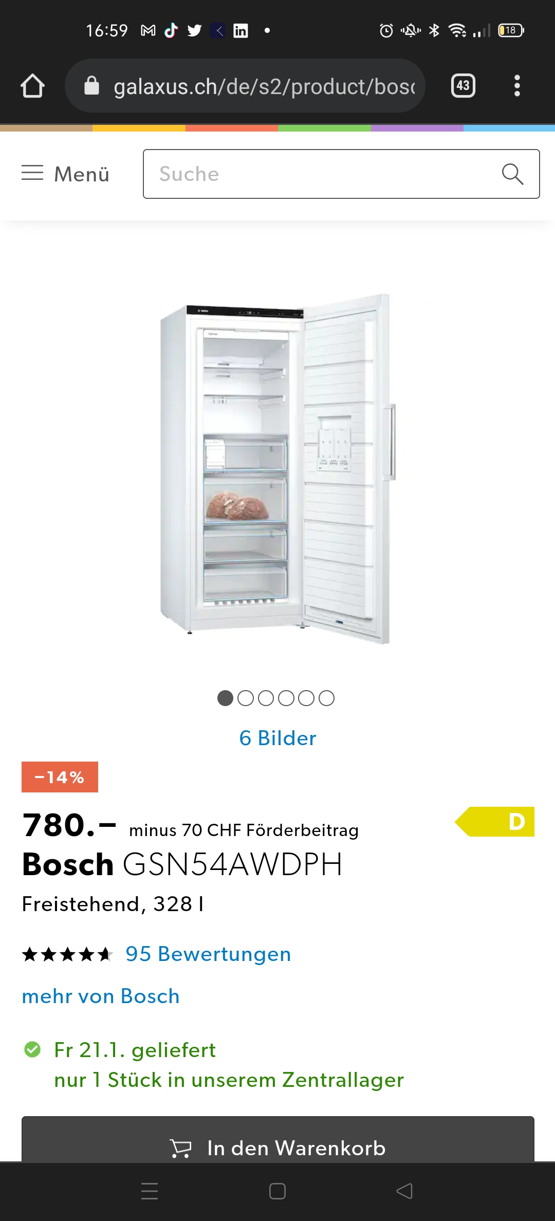 Bei Hornbach kann man derzeit den Gefrierschrank Bosch GSN54AWDPH zum günstigen Preis von 702 Franken bestellen, wenn man von der Tiefstpreisgarantie Gebrauch macht. Verweist dazu einfach auf das Angebot von digitec und schon gibt’s den Gefrierschrank mit 10% Rabatt für 702 Franken.
