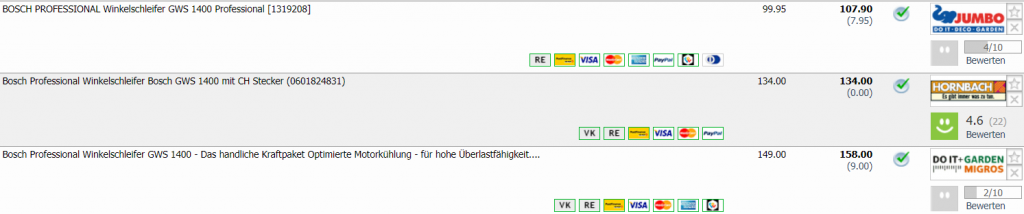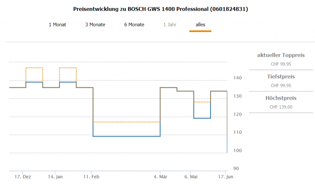 Bei Jumbo erhält man gerade den BOSCH GWS 1400 Professional Winkelschleifer für CHF 99.- Für die Lieferung werden zusätzlich CHF 7.95 fällig. Zweitbester Preis beträgt CHF 134.- bei Hornbach. Bestpreis war bei CHF 116.95