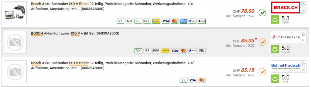 8Bei DayDeal gibt es das Bosch IXO V Bitset 32-teilige Set für nur CHF 37.90. Leider ist keine Preiskurve vorhanden, jedoch sind die anderen Angebote deutlich teurer. Das zweitbeste Angebot liegt bei CHF 78.-.