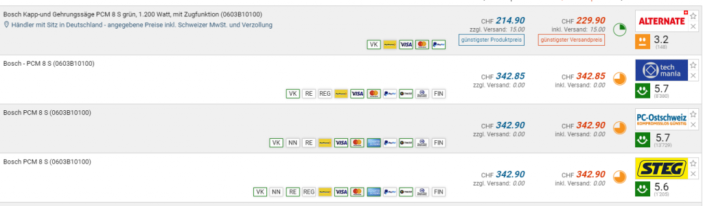 Bei Alternate gibt es wieder die Bosch Kapp-und Gehrungssäge PCM 8 S zu dem Bestpreis von CHF 229.90. Zuletzt war der Preis vor wenigen Wochen so niedrig. Das zweitbeste Angebot liegt bei CHF 342.85.