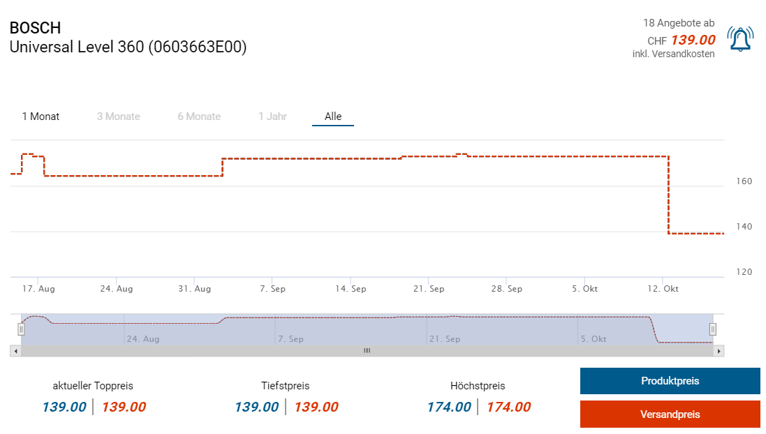 Bei Amazon gibts derzeit den selbstnivellierenden Kreuzlinienlaser UniversalLevel 360 von Bosch zum Bestpreis von knapp 114 Franken. Laut toppreise starten die Preise derzeit bei 139 Franken.