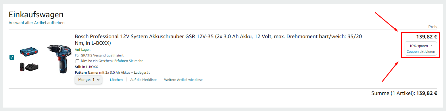 Dieses Angebot hätte ich kürzlich erst beim Umzug brauchen können - eventuell könnt ihr nun davon profitieren. Das Angebot ist super, so erhält man für CHF 138.80 (neuer Bestpreis) den Professional Bohrer von Bosch. Um auf den Preis zu gelangen, muss man den Artikel in den Warenkorb legen und dann dort den Coupon einlösen (siehe Screenshot). In der Schweiz kriegt man den Bohrer aktuell ab ca. CHF 200.-+