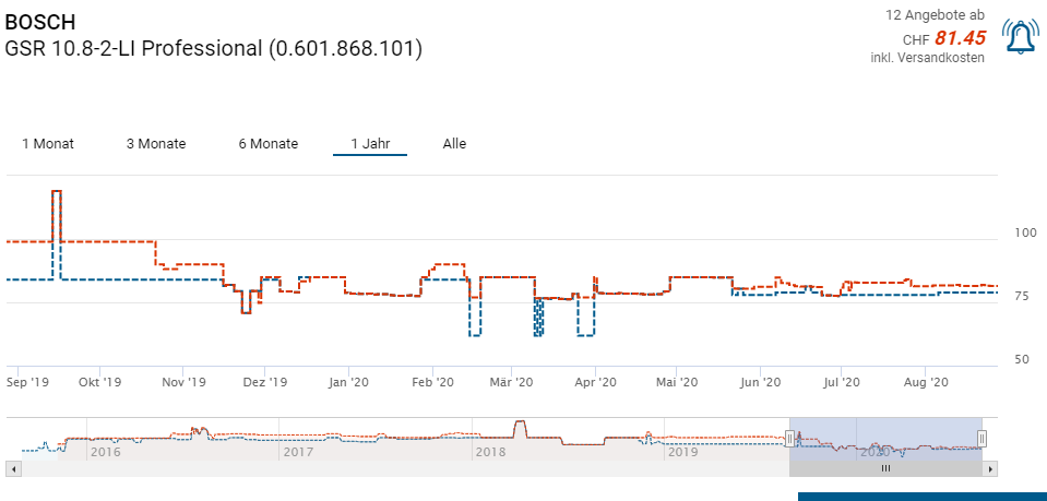 Bosch Professional Akku Bohrschrauber GSR 12V-15 Solo zum Bestpreis von 44.5 Euro / ca. 48 CHF bei Amazon.de. Keine Lieferung in die CH! Achtung, kein Akku, keine L-Box. Wird in Karton mit L-Boxeinlage geliefert. Neuware. Perfekt für alle, die schon Akkus haben und natürlich ein DE Postfach an der Grenze oder einen Bekannten in DE. Momentaner Vergleichspreis auf Toppreise 81.45 CHF. Tiefstpreis inkl. Versand gemäss Chart waren ca. 71 CHF.