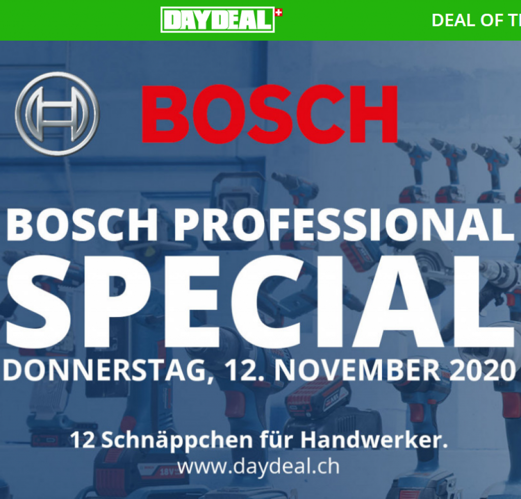 Diesen Donnerstag, 12. November 2020 gibt es bei Daydeal einen BOSCH Professional Tag. Es werden überden ganzen Tag verteilt 12 Profiwerkzeuge angeboten: