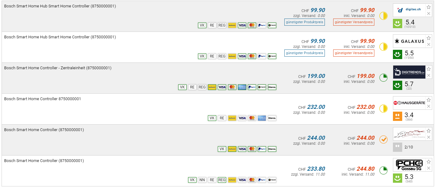 Bei digitec und galaxus gibt es den Bosch Smart Home Controller für den neuen Bestpreis von CHF 99.80. Der vorherige Bestpreis war CHF 198.-. Der zweitbeste Preis beträgt CHF 199.-.