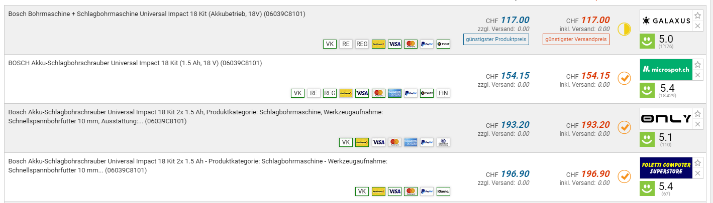 Bei Galaxus gibt es den BOSCH UniversalImpact 18 + Zusatzakku für CHF 117.-. Der vorherige Bestpreis war CHF 124.-. Der zweitbeste Preis beträgt CHF 154.15.