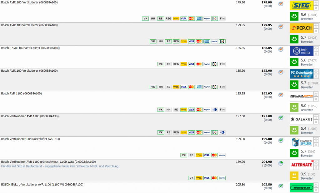 Bei Amazon gibt’s heute als Tagesangebot den Bosch Vertikutierer AVR 1100 für umgerechnet CHF 119.- inkl. Verzollung und Versand Zweitbester Preis in der Schweiz beträgt CHF 179.90 wobei der Bestpreis bei CHF 149.- war.