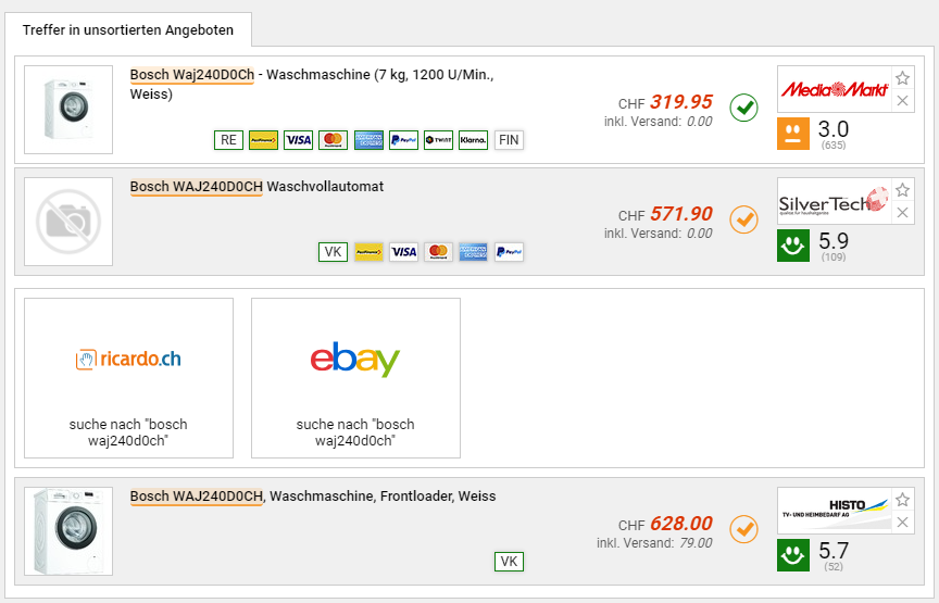 Bei Mediamarkt gibts derzeit die Waschmaschine WAJ240D0CH von Bosch zum neuen Bestpreis von knapp 320 Franken! Zuletzt lag der Preis mit 399 Franken schon recht tief, laut toppreise soll der Vergleichspreis bei knapp 572 Franken liegen.