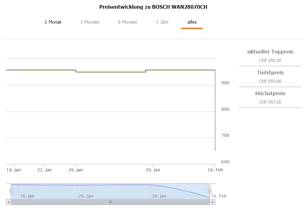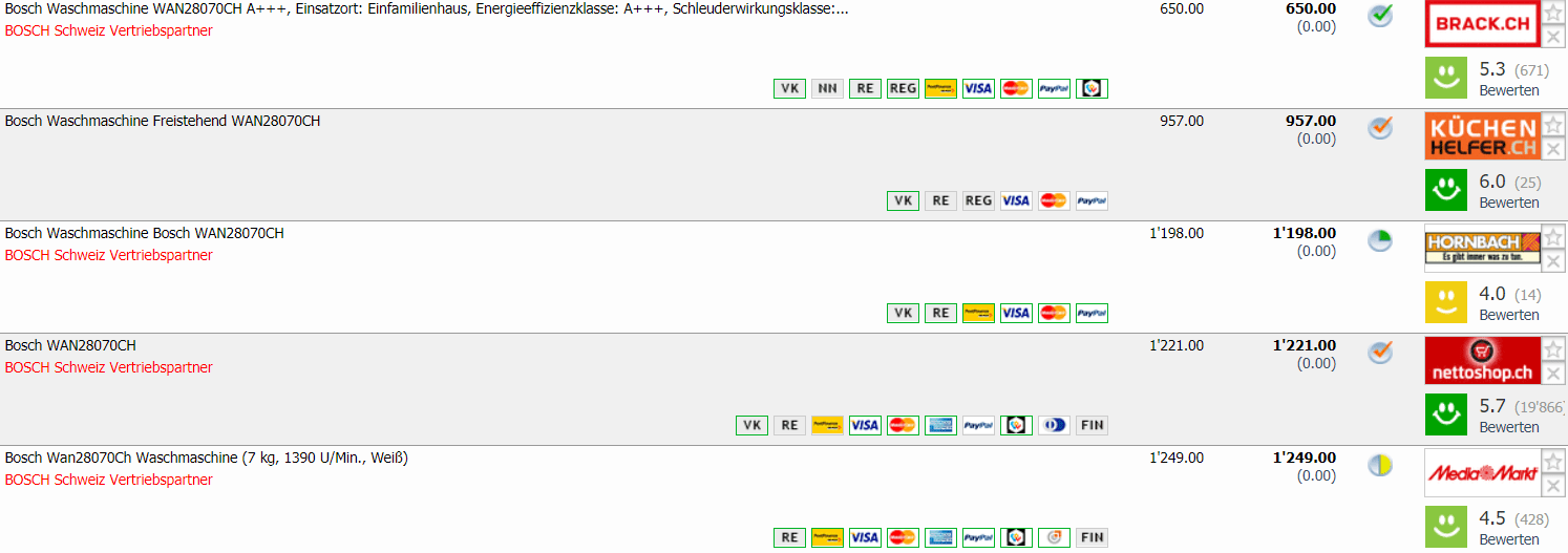 Bei brack gibt’s die BOSCH WAN28070CH Waschmaschine für CHF 650.- Zweitbester Preis liegt bei CHF 957.- Bestpreis war bei CHF 949.- Besonders interessant, weil man für die Waschmaschine beispielsweise auch bei Hornbach mit seiner Tiefstpreisgarantie satte CHF 1198.- hinblättern muss.