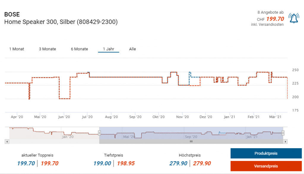 Bei Mediamarkt und Amazon gibts derzeit den Lautsprecher Bose Home Speaker 300 zum Aktionspreis von CHF 199.- für die schwarze resp. CHF 189.10 für die silberne Variante. Laut toppreise ist dies derselbe Bestpreis wie im Sommer letzten Jahres.