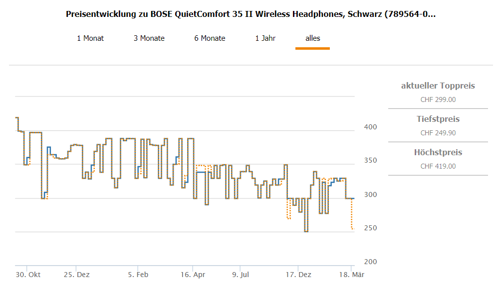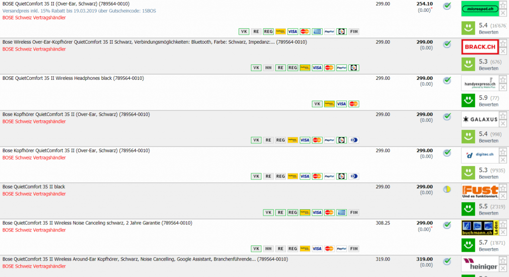Bei microspot gibt’s mit dem Code 15BOS 15% Rabatt auf die BOSE QuietComfort 35 II (Over-Ear, Schwarz). Damit gibt’s den Kopfhörer für CHF 254.15 Der zweitbeste Preis beträgt CHF 299.- Die CHF 254.- sind kein Bestpreis, aber trotzdem ein gutes Angebot.