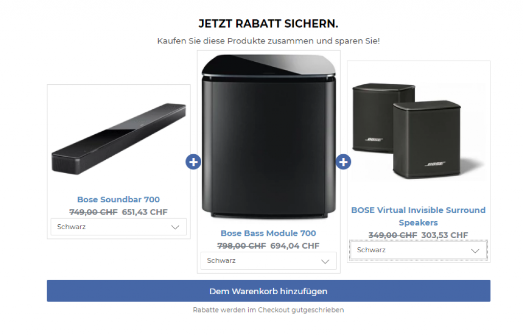 Bei qualityproducts.ch gibt es momentan die Bose Soundbar 700 mit Subwoofer und Rear Speakern im Bundle für CHF 1649.-, sowohl in Schwarz als auch in Weiss. Man muss nur die Produktseite aufrufen und dann ein wenig runter scrollen, dann wird einem schon das Bundle vorgeschlagen.
