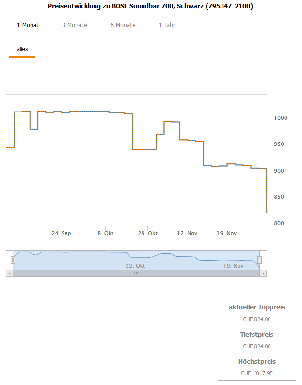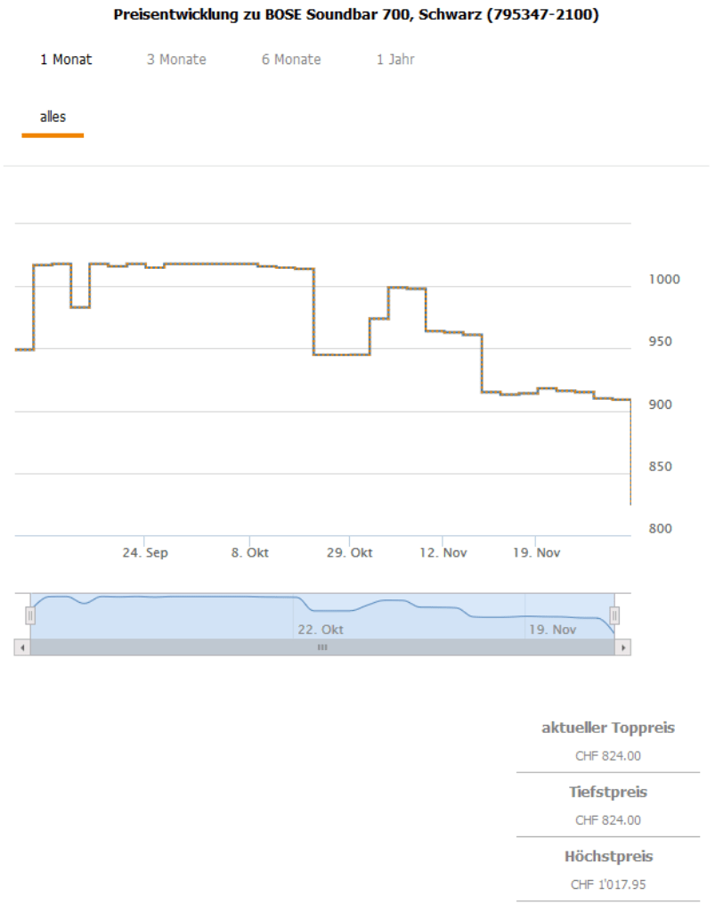 Der bestprice über alle Farben war bislang bei 839.90 CHF, der zweitbeste Preis aktuell liegt bei 908.95 CHF.