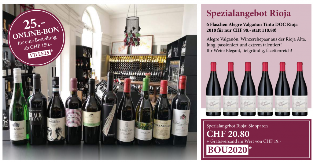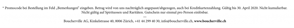 Bei Boucherville Weinhandlung gibt’s mit dem Gutscheincode VILLE25 25.- Rabatt ab einem Bestellwert von CHF 150.- Wichtig ist, den Gutscheincode im Feld Bemerkungen einzutragen. Der Rabatt wird erst nachträglich abgezogen. Siehe Screenshots unten.