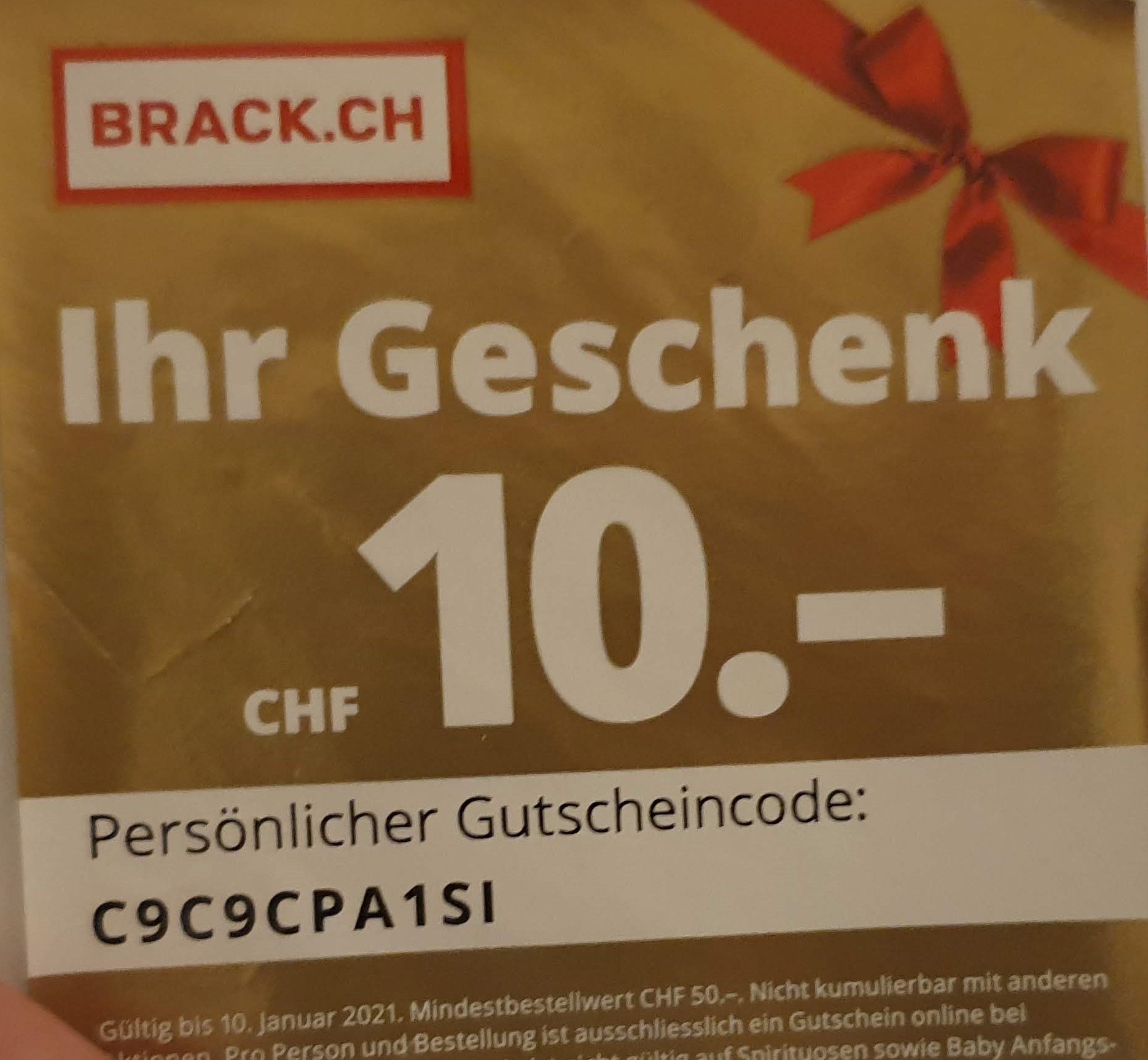 Gültig bis 10. Januar 2021. Mindestbestellwert 50 Fr. Nicht kumulierbar mit anderen Aktionen. Pro Person und Bestellung ist ausschliesslich ein Gutschein online bei brack.ch einlösbar. Der Gutschein ist nicht gültig auf Spirituosen sowie Baby Anfangs- und Spezialmilch.