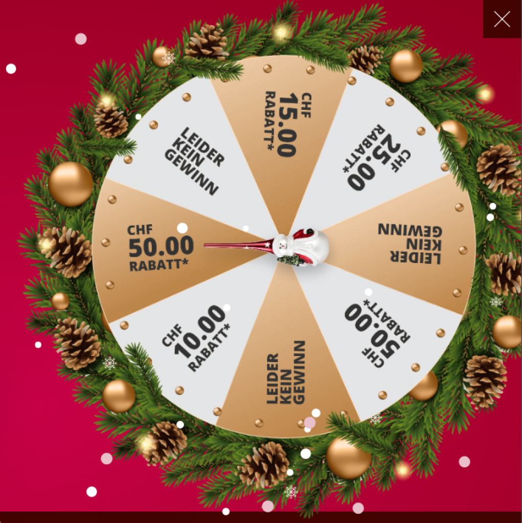 Beim Weihnachtsglückrad könnt ihr verschiedene Gutscheine gewinnen/generieren. Die Gutscheine haben jeweils einen Mindestbestellwert. Nicht exakt nachgeprüft, aber pro IP Adresse konnte ich ca. 8x (mit verschiedenen Emailadressen) teilnehmen.