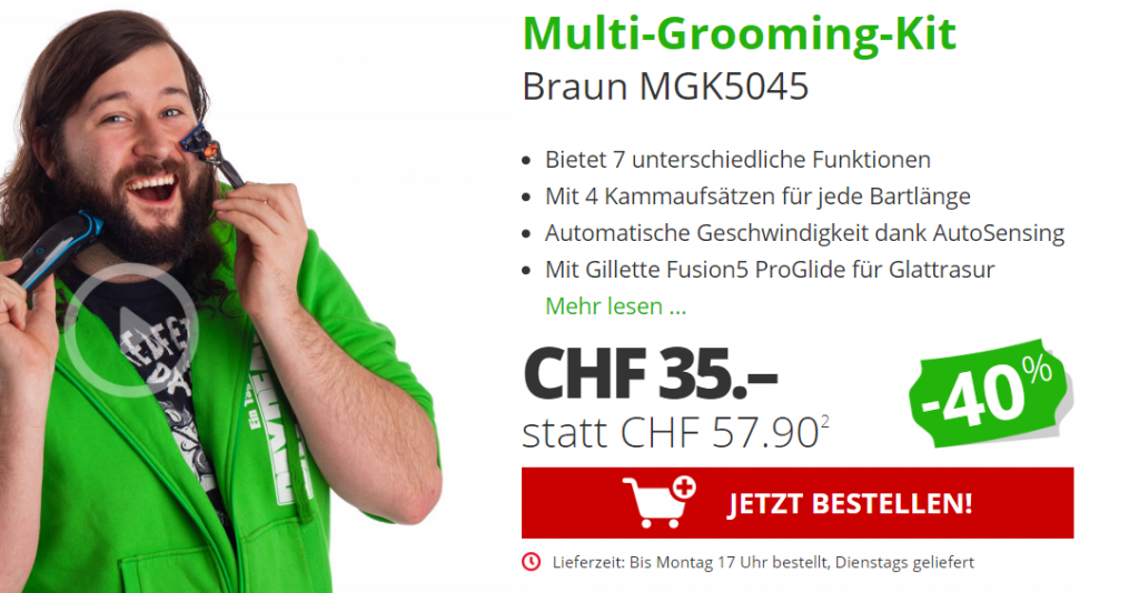 Bei DayDeal gibt es das Braun MGK5045 Multi-Grooming-Kit für den neuen Bestpreis von CHF 35.-. Der vorherige Bestpreis war CHF 41.05. Der zweitbeste Preis beträgt CHF 49.65.