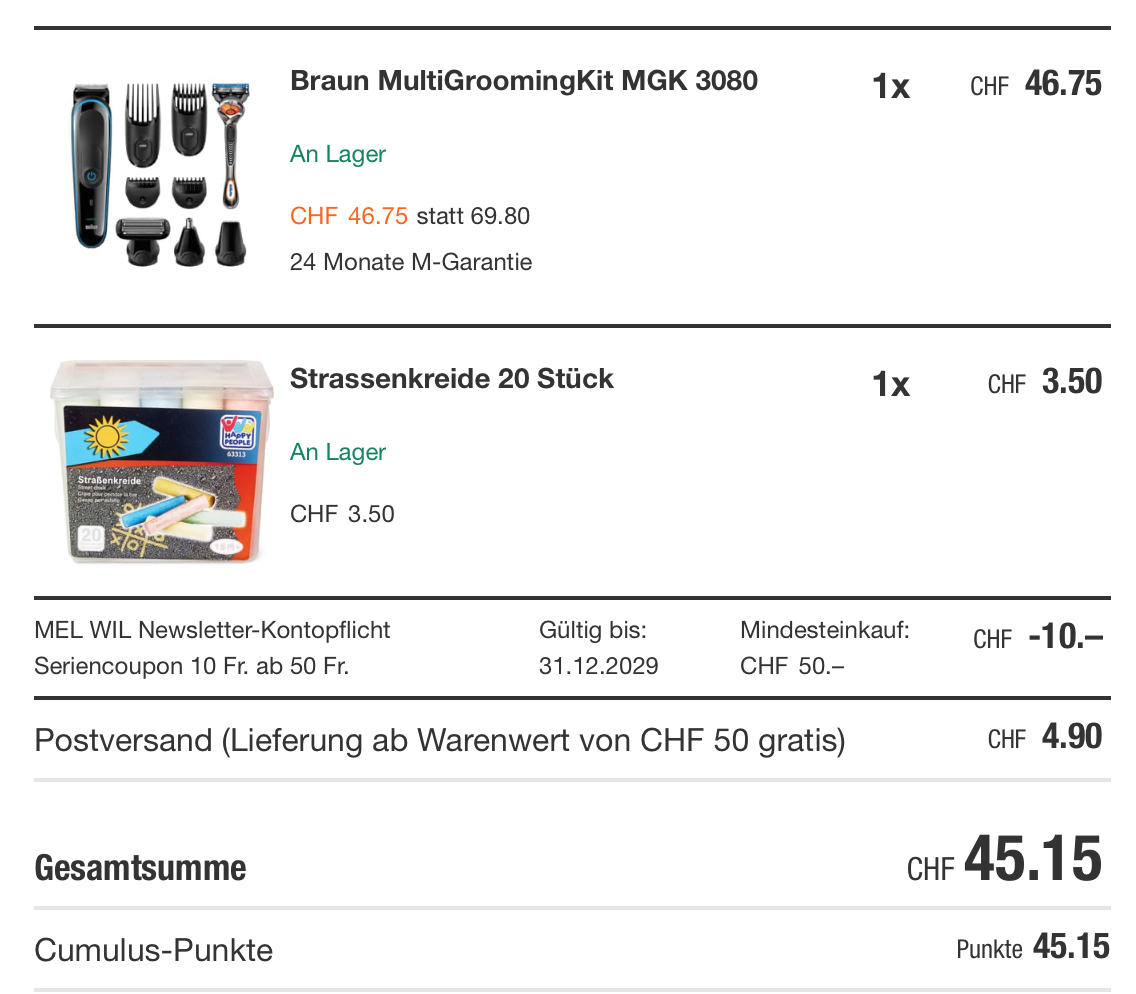 Danke, konnte auf die schnelle auch keinen Unterschied zwischen dem MGK3085 und dem MGK3080 finden. Aber die Strassenkreiden (und die Cumuluspunkte) sind schon auch ganz toll :P