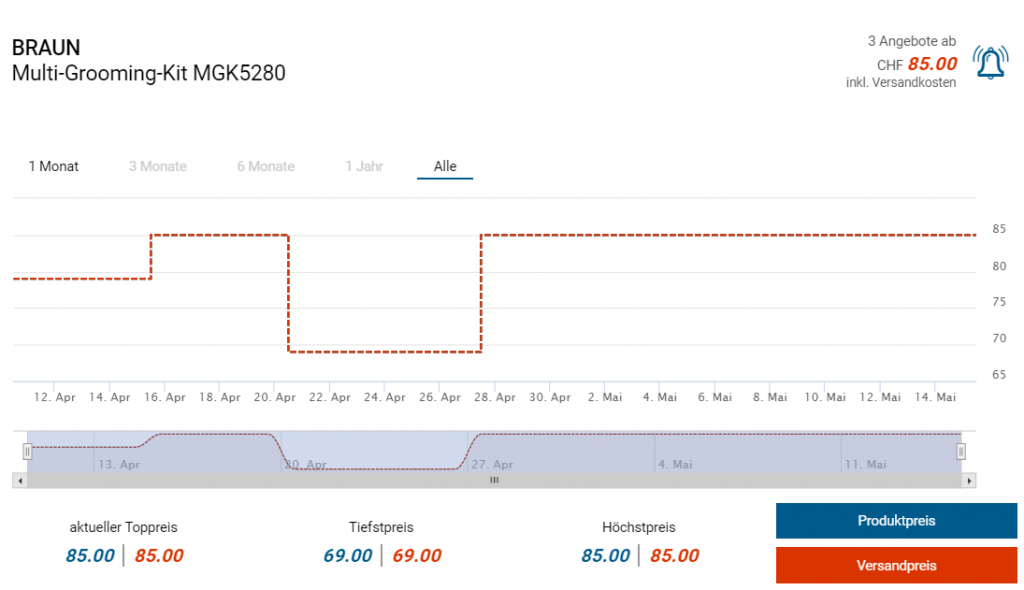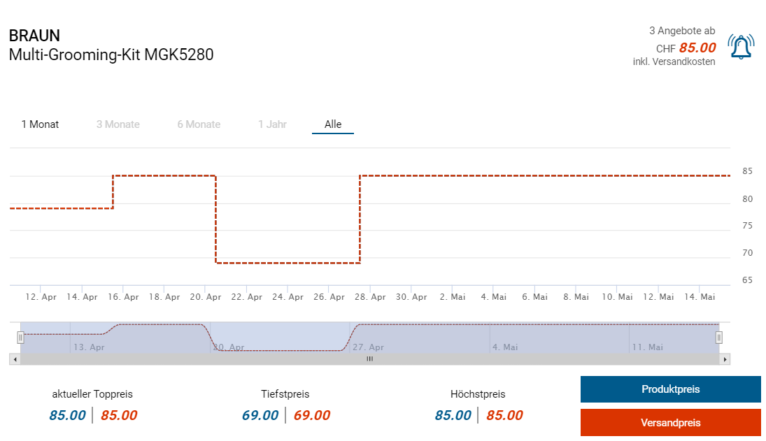 Bei Amazon Spanien gibts derzeit das Multi Grooming-Kit von Braun zum neuen Bestpreis laut toppreise, eine Preispirat-Recherche ergab zudem keinen Deal, der das Gegenteil bezeugen würde. Der bisherige Bestpreis lag bei 69 Franken, zurzeit müsste man aber mindestens 85 Franken dafür zahlen.