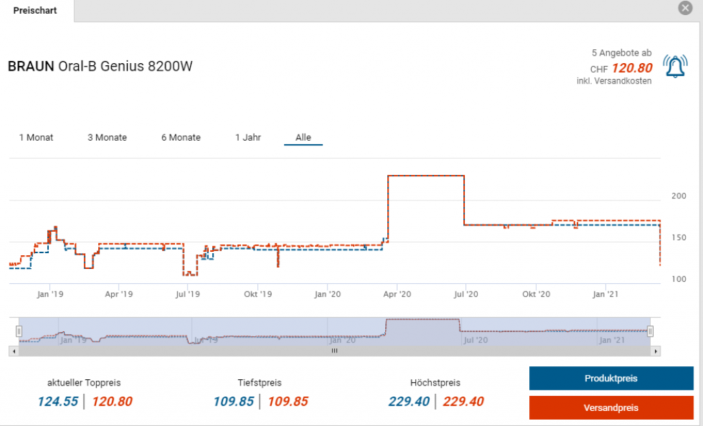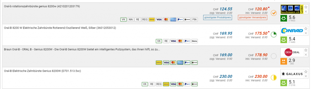 Bei Buchmann.ch gibt es die BRAUN Oral-B Genius 8200W elektrische Zahnbürste für den Bestpreis von CHF 120.80 (124.55 – 3% Vorkassenrabatt). 2019 gab es den Artikel für CHF 109.85. Der zweitbeste Preis beträgt CHF 175.50.