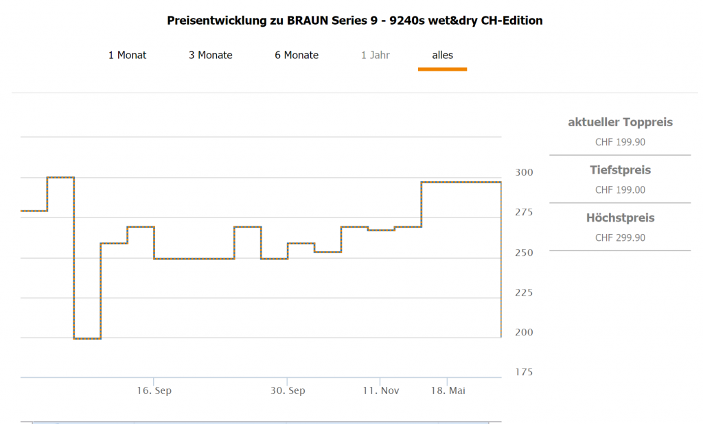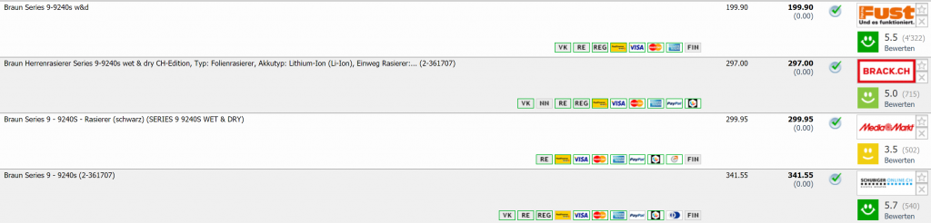 Bei Fust erhält man gerade den Braun Series 9-9240s wet&dry für CHF 189.90, wenn man den Gutscheincode NEWS20 beim Checkout einsetzt. Zweitbester Preis bei CHF 297.- Bestpreis war bei CHF 199.90