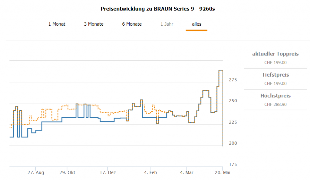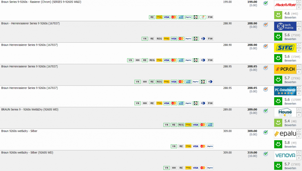 Ebenfalls als Teil der „Party des Jahres“ gibt’s den Braun Series 9-9260s bei MediaMarkt in den Tagen für CHF 199.- Zweitbester Preis in der Schweiz beträgt CHF 288.90 Bestpreis war bei CHF 221.45, wobei das schon fast ein Jahr her ist.