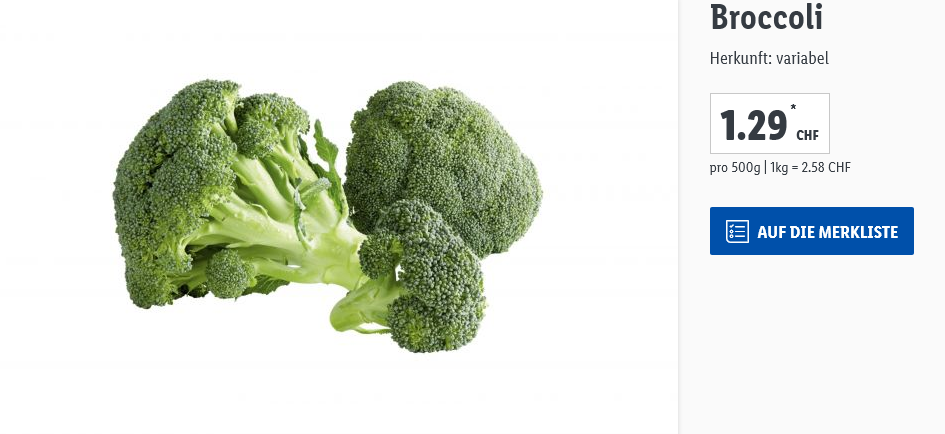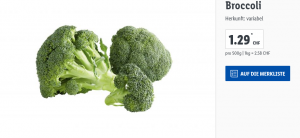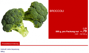 Bei Aldi ist ab morgen Broccoli - Aktion. Ein 500g-Stück ist für CHF 0.79 zu haben: