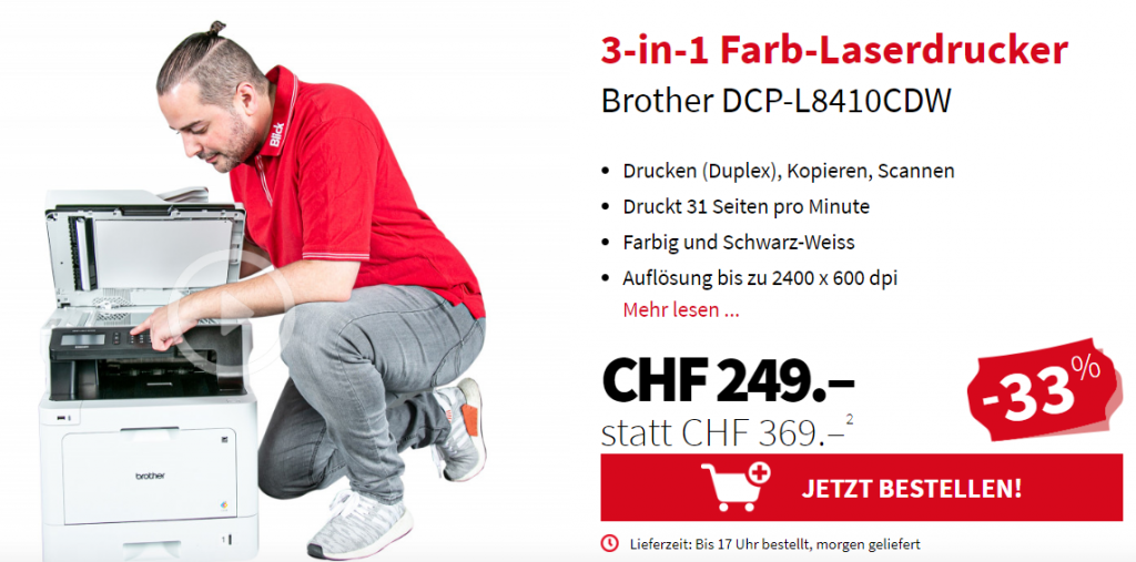 Bei BlickDeal gibt es den Brother DCP-L8410CDW für den neuen Bestpreis von CHF 249.-. Der vorherige Bestpreis war CHF 296.- und der zweitbeste Preis beträgt CHF 339.95.
